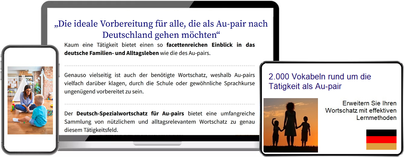 Für das Erlernen des Au-Pair Wortschatzes wird ein gewisser Grundwortschatz bzw. umfangreiche Kenntnisse der deutschen Sprache vorausgesetzt. Das benötigte Grundwissen erlangen Sie mit dem Deutsch Sprachkurs für Anfänger und für Fortgeschrittene. Sie können selbst entscheiden, wann, wieviel und wo Sie lernen möchten. Wir empfehlen jedoch 20 bis 30 Minuten täglich, anstatt große und dafür unregelmäßige Lerneinheiten zu machen.